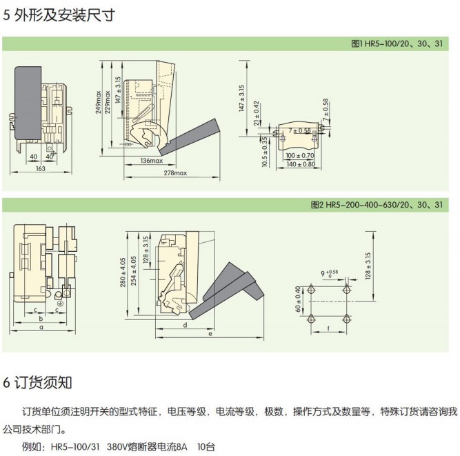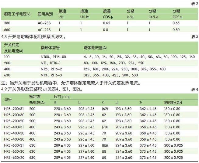HR5系列熔斷器式隔離開關(guān)(以下簡稱開關(guān))主要用于額定電壓交流380V和660V(42~62Hz),約定發(fā)熱電流至630A的具有高短路電流的配電電路和電動機(jī)電路中,作為電源開關(guān)、隔離開關(guān)、應(yīng)急開關(guān),并作為電路保護(hù)用,但一般不作為直接開閉單臺電動機(jī)之用。 符合標(biāo)準(zhǔn):GB 14048.3、IEC 60947-3。
