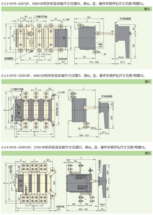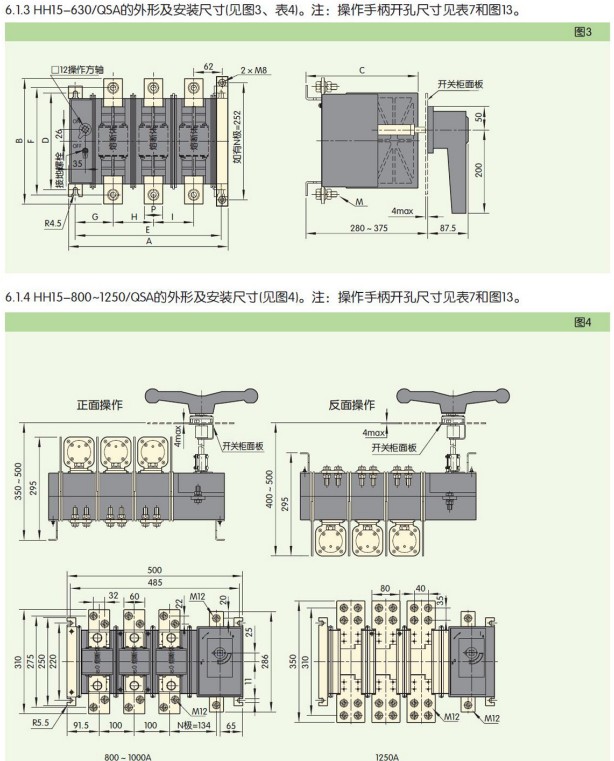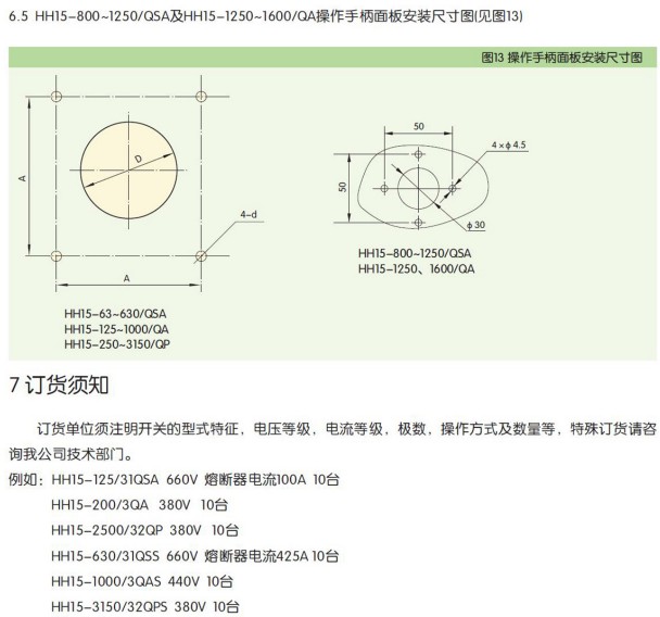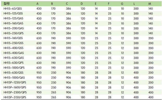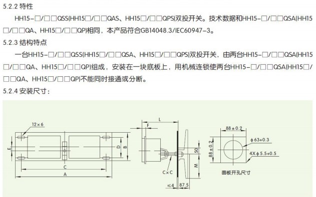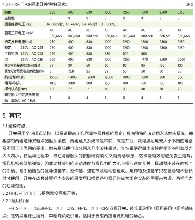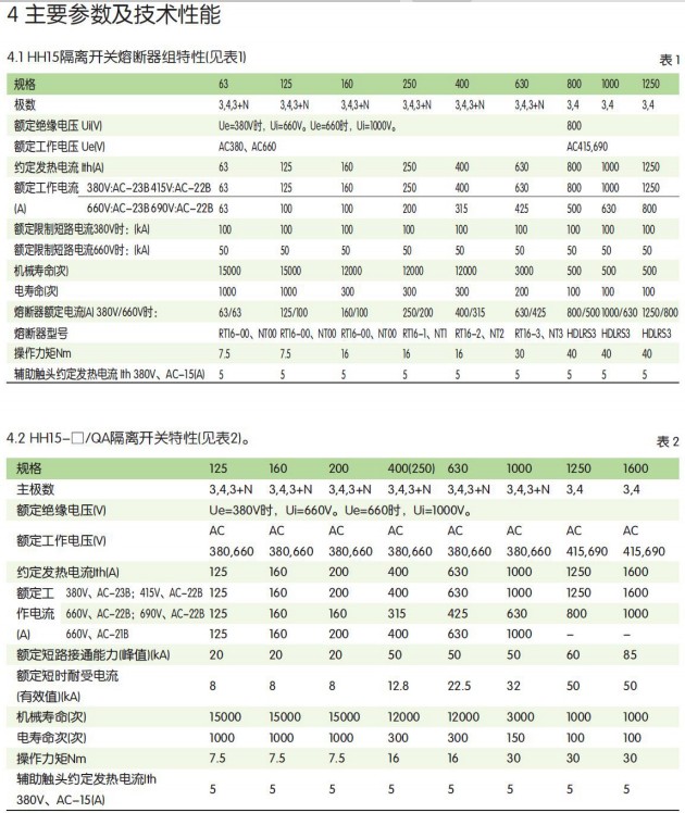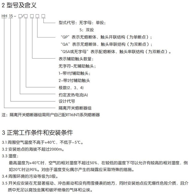 1適用范圍 HH15系列隔離開關(guān)熔斷器組,QA及QP系列隔離開關(guān)(以下簡稱開關(guān)),開關(guān)主要使用在具有高短路電流的配電電路和電動機電路中,作為手動不頻繁操作的主開關(guān)或總開關(guān)。尤其適合于安裝在較高級的抽屜式低壓成套裝置中。 符合標準:GB 14048.4、IEC 60947-4-1。