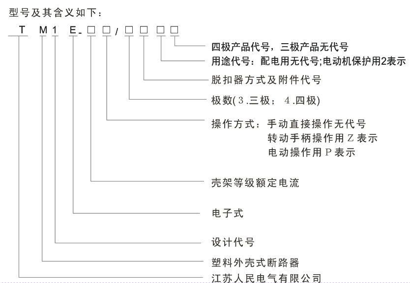 7.安裝具有互換性:外形尺寸與TM1系列塑殼斷路器規(guī)格相同。 | 型號(hào)及含義